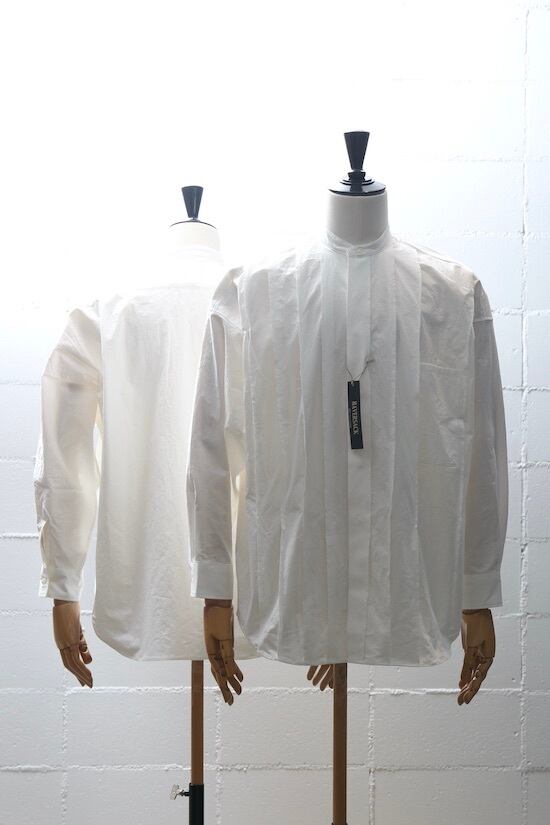 前身頃にランダムに施した裁ち目使いのプリーツが特徴のバンドカラーシャツ。
