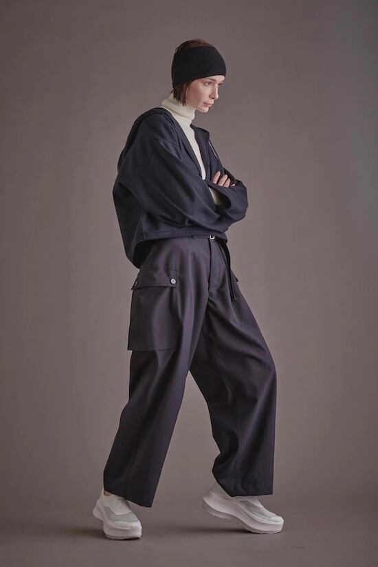 深い股上と深い前身のダーツからのワイドテーパードシルエットに仕上げ、後身には片玉縁ポケットを施し、機能面も考慮した作りになっています。