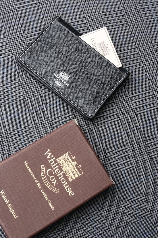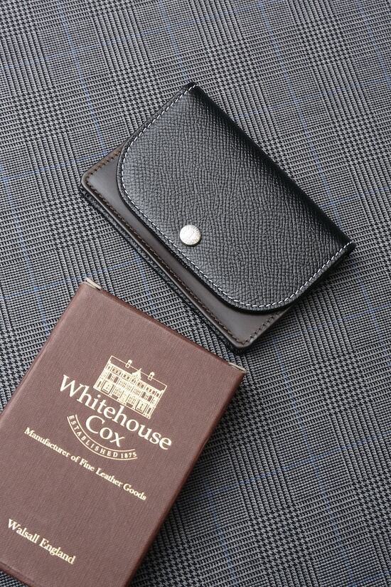 フラップ付きの名刺入れです。メインのカード室にはマチを付けて十分な容量を確保しており、カード類を豊富に収納できるのが特徴です。その前後にもカードポケットを備えています。フラップのスナップボタンには、ホワイトハウスコックスのネームが刻印されています。